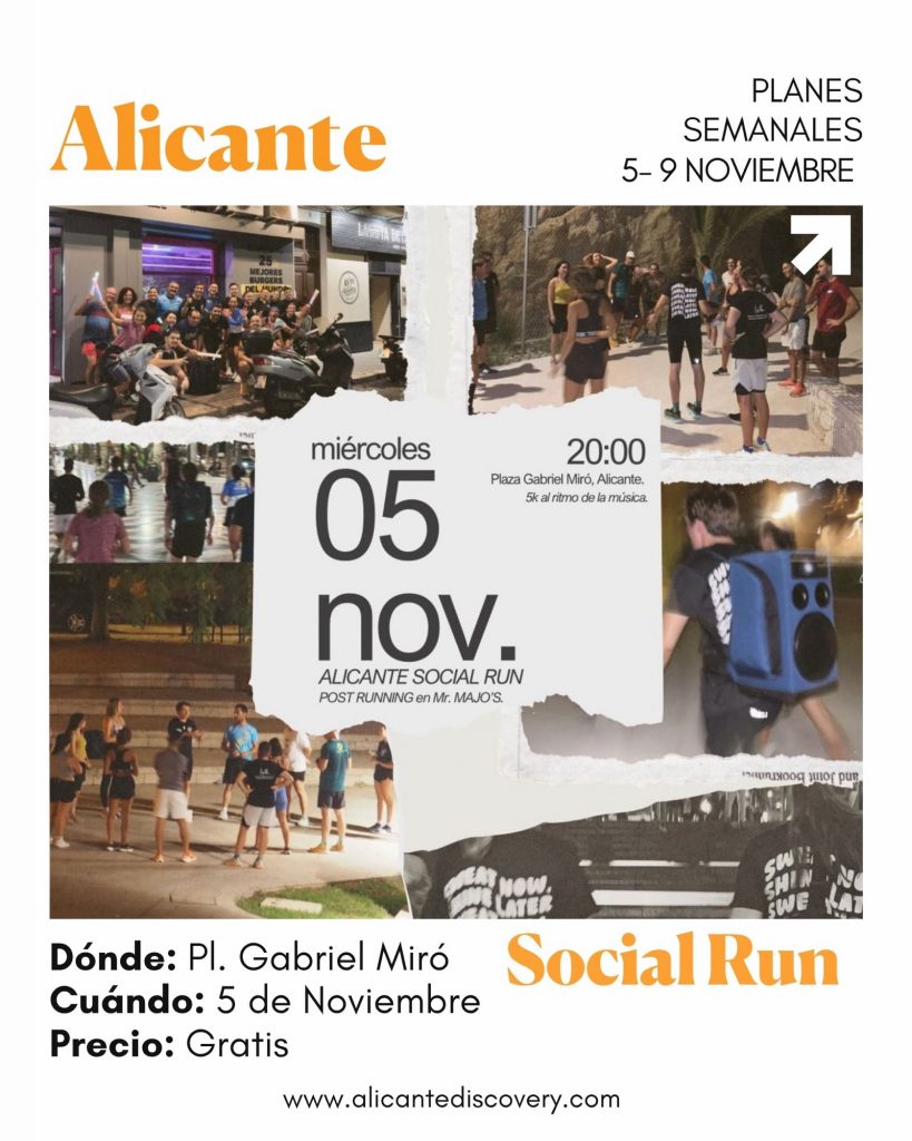 Una cita perfecta para los que disfrutan del deporte y el buen ambiente. El grupo Alicante Social Run organiza una carrera urbana de 5 km al ritmo de la música, con salida desde la Plaza Gabriel Miró. Después, el plan continúa con post-running y cerveza en Mr. Majo’s 🍻.